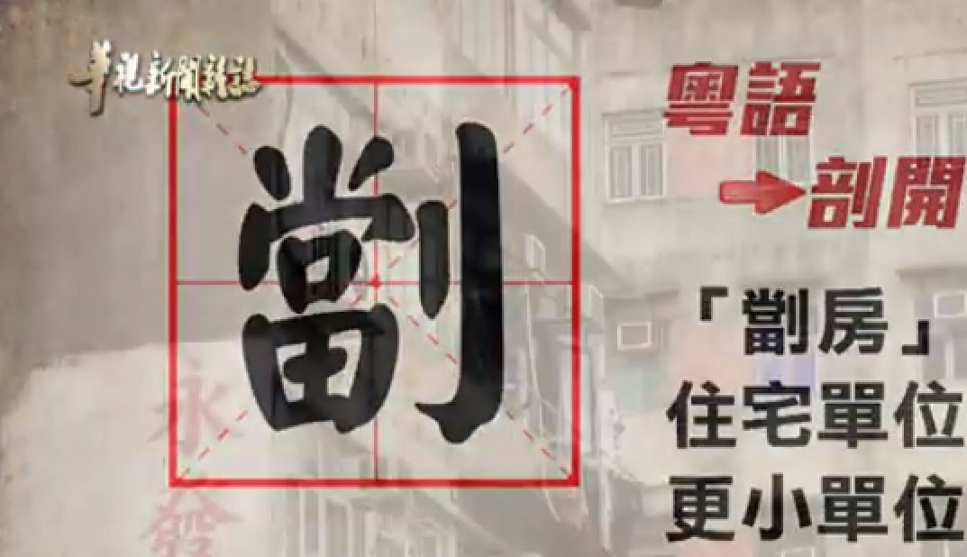 台湾人看不起香港的住房,华视在教这个香港字:劏(读一声的tang)。劏,本来是杀猪的意思,后来被香港人用于「把一套房间宰成独立的好几套」。