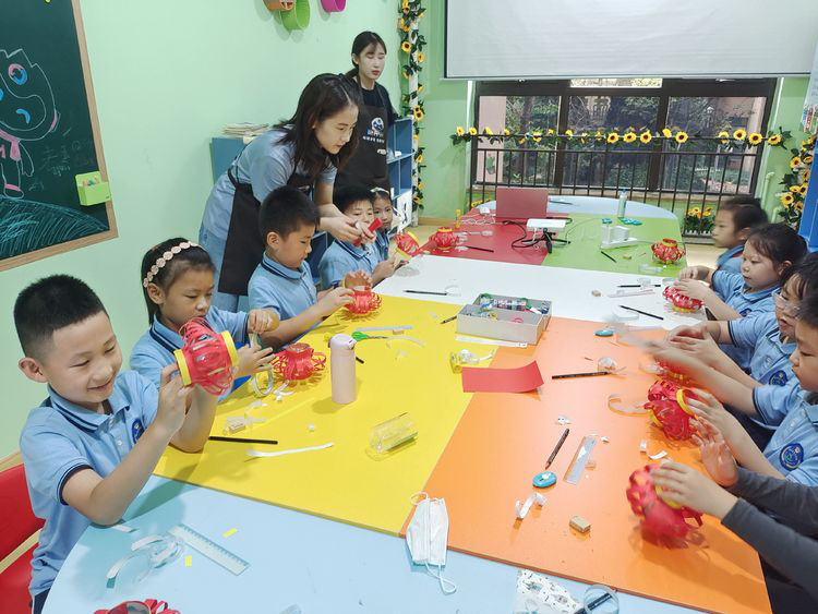 小朋友们在工作人员的演示下制作手中的手工艺品,虽然有的小朋友做的歪歪扭扭,但是在工作人员的耐心讲解和手把手指导下,小朋友们认真投入制作,大家尽情发挥自己的想象力,举一反三,最后制作出各式各样的小灯笼。