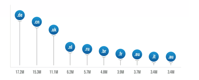 截至 2021 年 12 月 31 日,注册量排名前 10 位的 ccTLD(国家及地区顶级域名) 分别是是:.de、.cn、.uk、.nl、.ru、.br、.fr、.eu、.it 和 .au。
