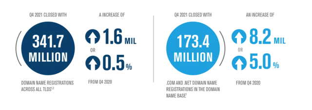 截至 2021 年第四季度末,.com 和 .net 新域名注册总数为 1060 万,而 2020 年第四季度末(去年同期)域名注册为 1050 万。