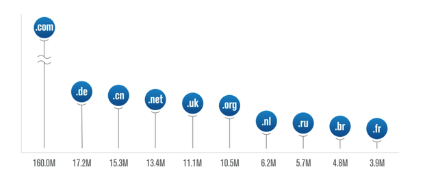 截至 2021 年 12 月 31 日,按报告域名数量计算最大(注册量最高) 的TLD 是:.com、.de、.cn、.net、.uk、.org、.nl、.ru、.br 和 .fr。
