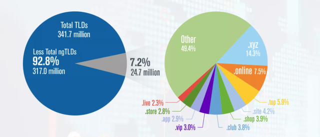 ngTLD(新顶级域名) 域名注册总数为 2470 万,与 2021 年第三季度相比,域名注册增加了 120 万,或 5.1%。