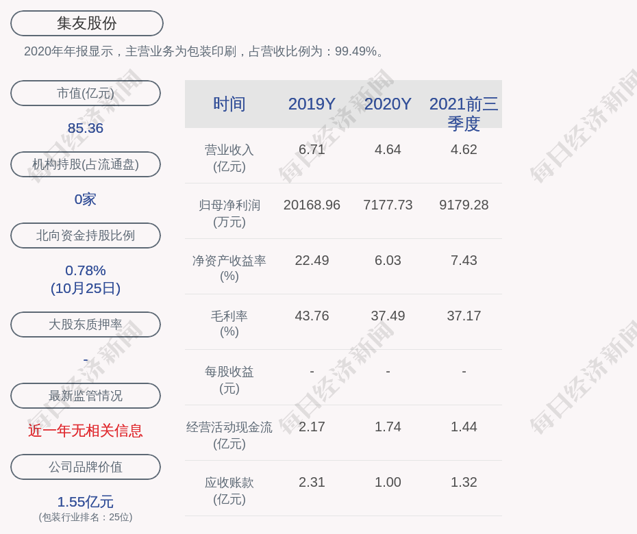 2020年年报显示,集友股份的主营业务为包装印刷,占营收比例为:99.49%。