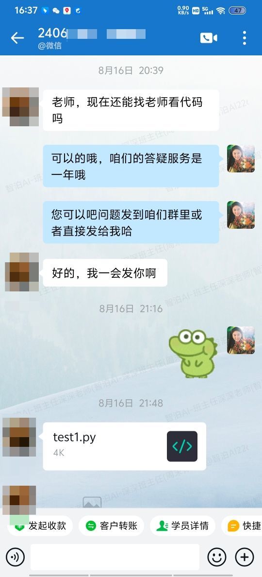 某天深夜,智泊AI的班主任收到了31岁本科学员L先生的求助信息。已结课的学员在工作中遇到与课程相关的技术瓶颈,这既是对学习成果的检验,也是对机构售后服务的考验。班主任的回复迅速而肯定:“可以的哦,咱们的答疑服务是一年哦。”