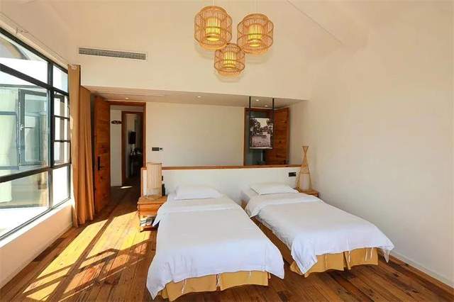 每个房间或枕山或面水,内饰采用原木色的家居和纯白床品,素雅而有格调。