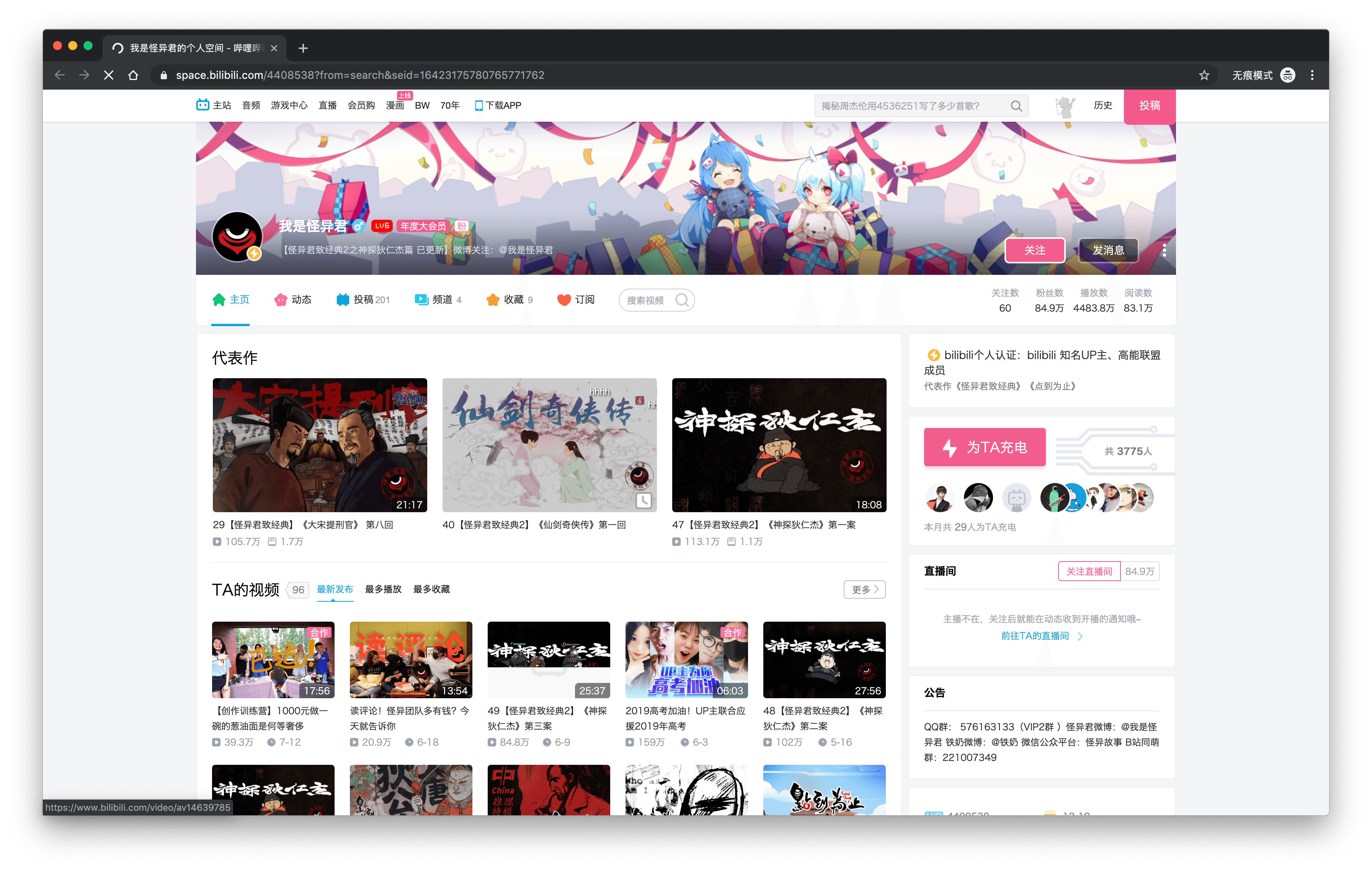 @我是怪异君:做影视二次解说创作的,不像那些念经式的电影电视剧讲解,而是加入了非常多的自己的内容,娱乐向的 UP 主,也会推荐非常多的推理类内容。