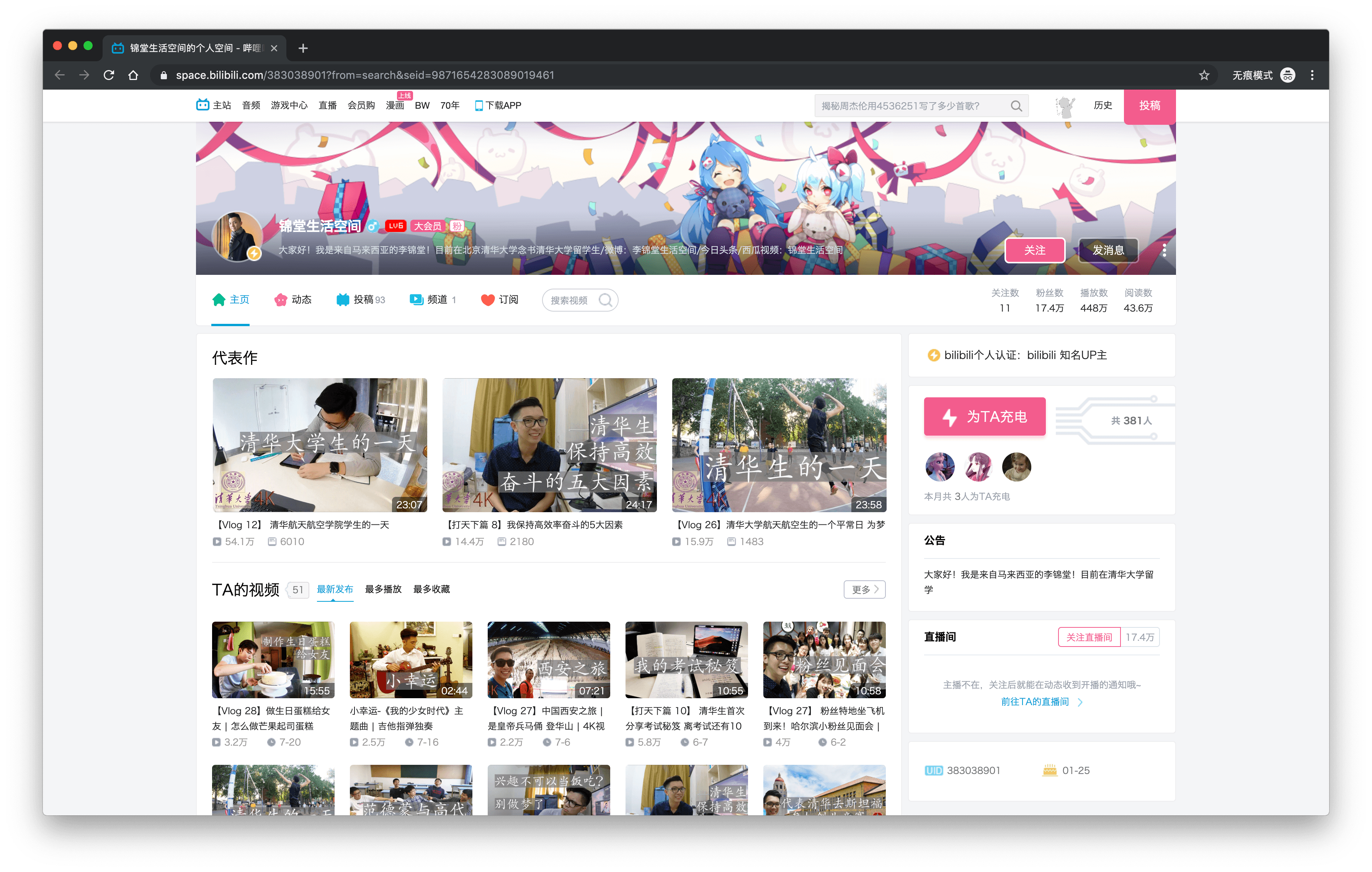 @锦堂生活空间:来自马来西亚的清华大学留学生,喜欢打 DOTA 2,有创业打天下的梦想,分享清华大学的学习和自律日常,在不计其数的「高材生+校园」的 vlog 里面凭借着乐观的心态和塑料但可爱的普通话,让我持续关注着。