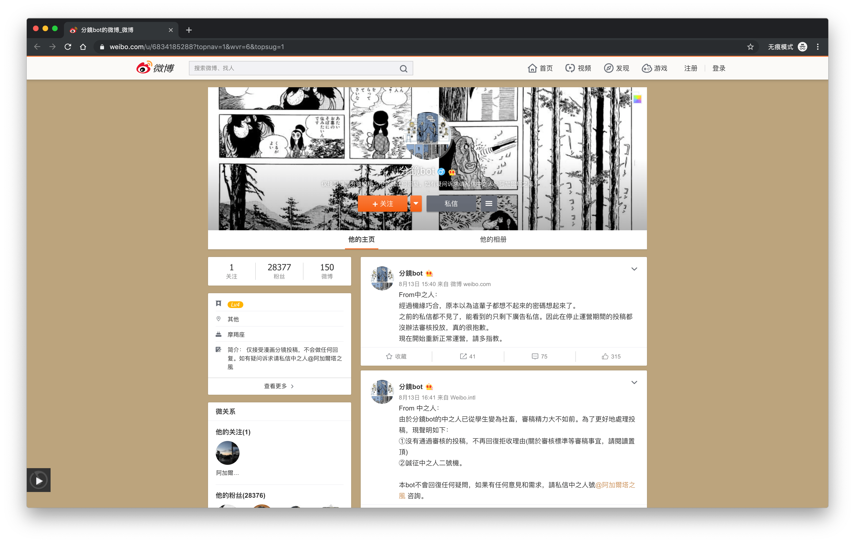 @分镜bot:接受私信投稿的账号,主要是分享一些漫画的有趣分镜,并且要求投稿都附上推荐的理由,经常会看到一些让人眼前一亮的漫画。