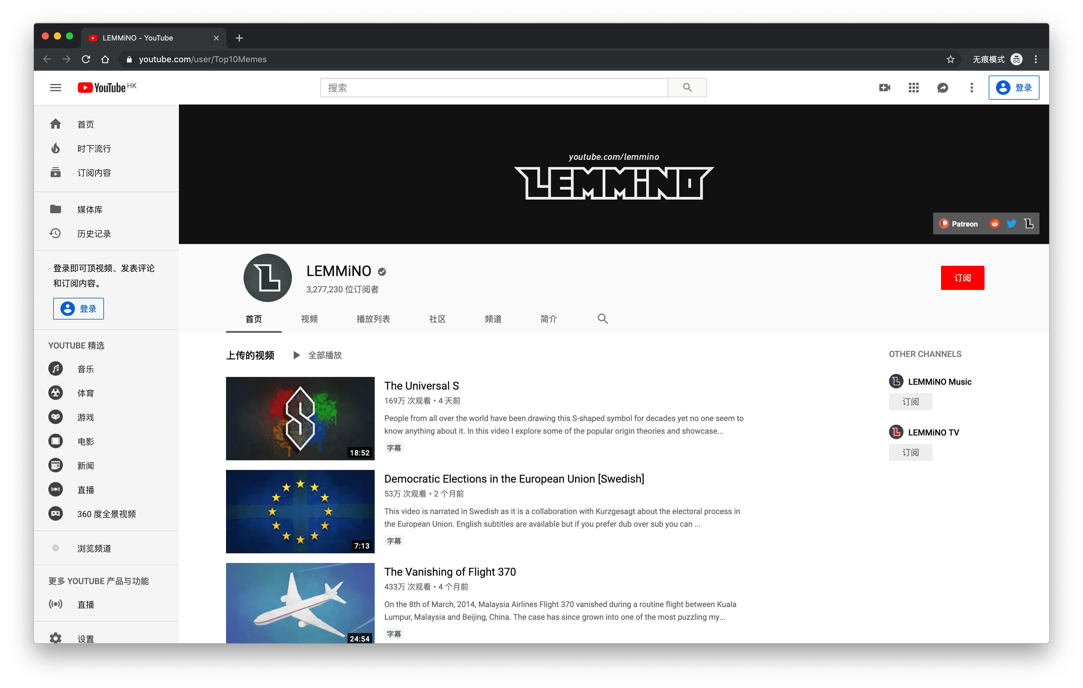 LEMMiNO:这是我认为制作最认真 视频最精良 的 channel 没有之一,没有一期水的,也不功利。多的是科学文化的科普的内容,最感动人的以前做的年度总结 特别喜欢这位的观点 非常宏大。