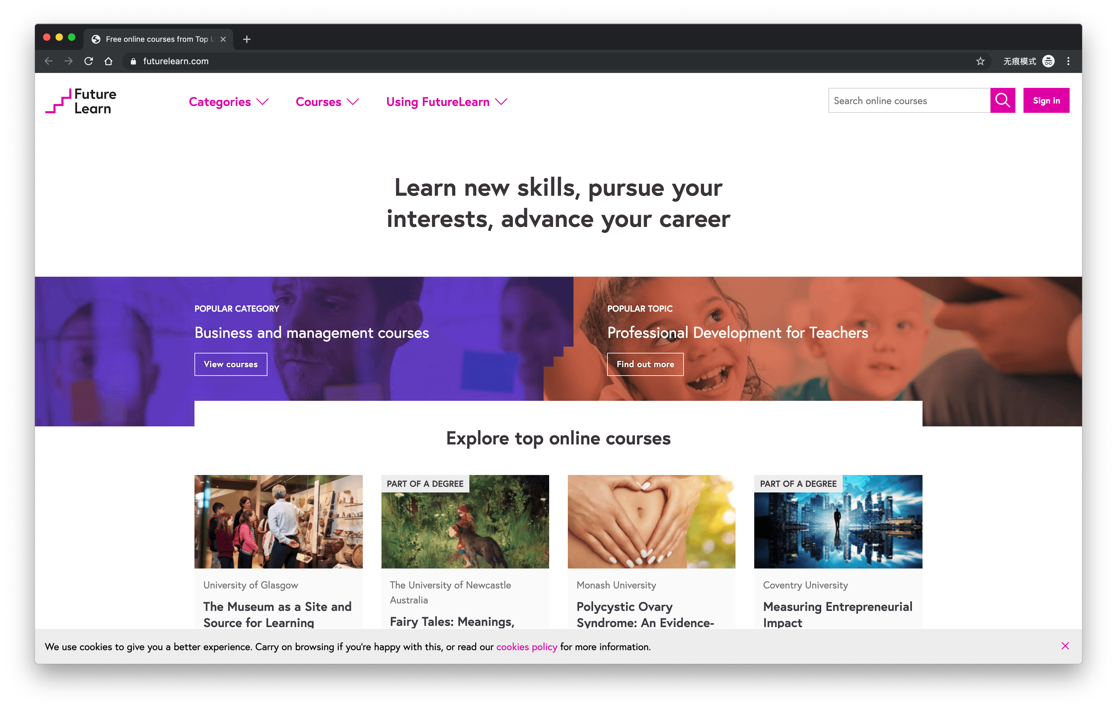 Future Learn:广大学习爱好者不容错过的公开课学习平台,虽然它的内容相比Coursea、edX 更为小众,但是它竟然有西班牙语、意大利语、德语的专项学习课程,还有 Haskell 函数编程、weka 数据挖掘、Python 图形化界面开发,有全球时尚变化、能源革命、生活中的化学物质、冥想与正念、领导力……