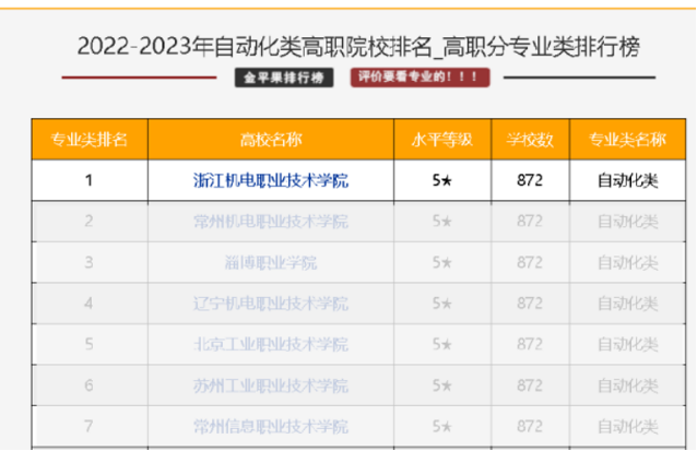 2020年荣列全省第一;2021年全省高职院校督导评估排名第一。获评国家级教学成果奖一等奖2项、二等奖3项,省级教学成果奖特等奖2项、一等奖8项、二等奖5项。建有2个中国特色高水平专业群,7个专业被认定为教育部骨干专业,2个专业被教育部认定为示范专业点,7个专业被评为省“十三五”优势专业,5个专业被评为省“十三五”特色专业,4个专业被评为省名专业,国家骨干专业和优势特色专业数量均居全省前列。《“金平果”2020-2022年全国高职高专院校竞争力排行榜》显示,学校两个“双高计划”专业群均排名第一方阵;自动化类专业高职院校中排名全国第一;智能控制技术、工业设计专业位列全国第一;机械制造及自动化专业位列全国第二。