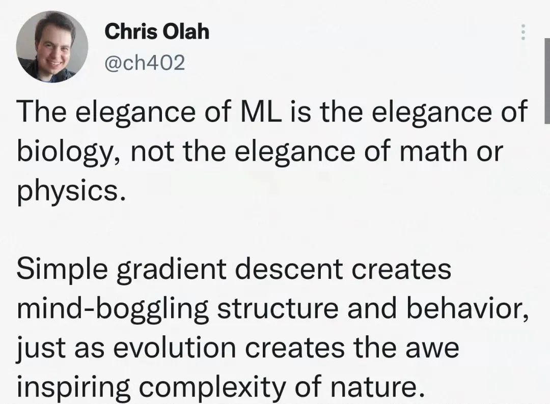 ML的优雅是一种生物学的优雅,而非数学或物理的那种优雅。梯度下降创造了令人难以置信的结构和行为,正如进化创造了令人敬畏的自然复杂性。