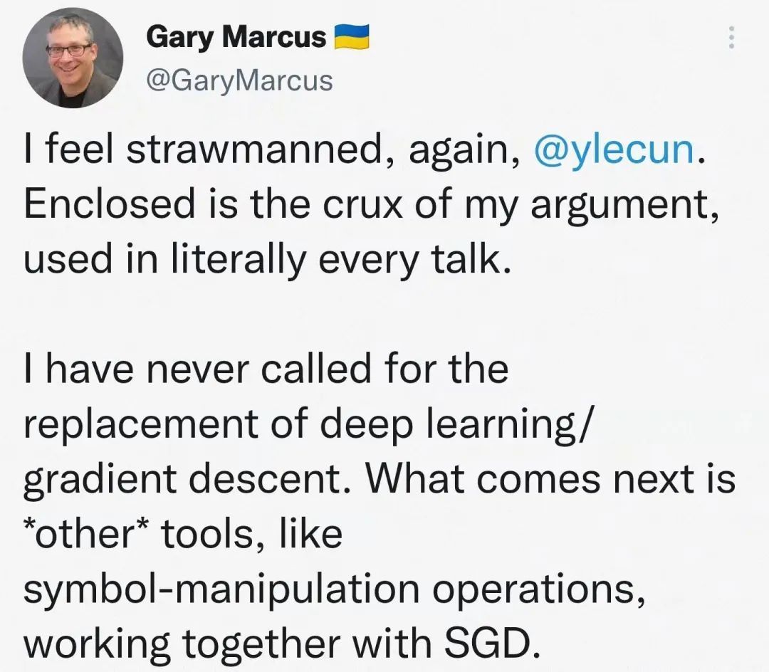 我感觉自己又被「稻草人谬误」攻击了,附上我的论点核心:我从未呼吁要替代深度学习/梯度下降。未来会出现的是「其他」工具,比如与SGD一起工作的符号处理操作。