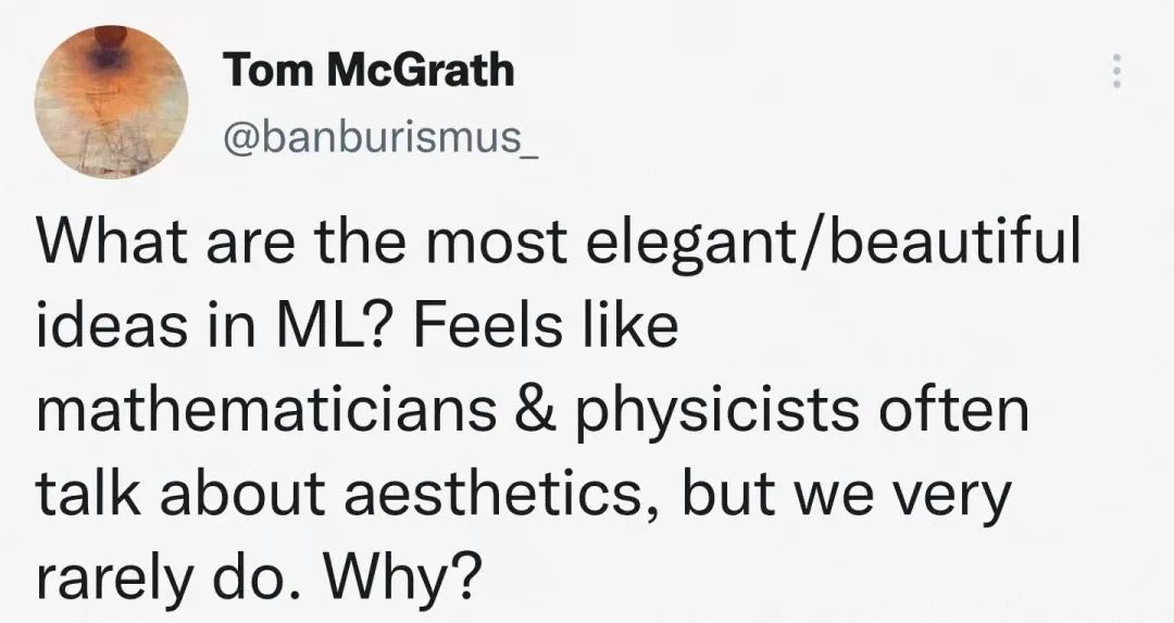 几天前,有人在推特上发帖问: 在机器学习中,最优雅美丽的idea是什么?感觉数学家和物理学家经常谈论美学,但我们却很少,为什么?