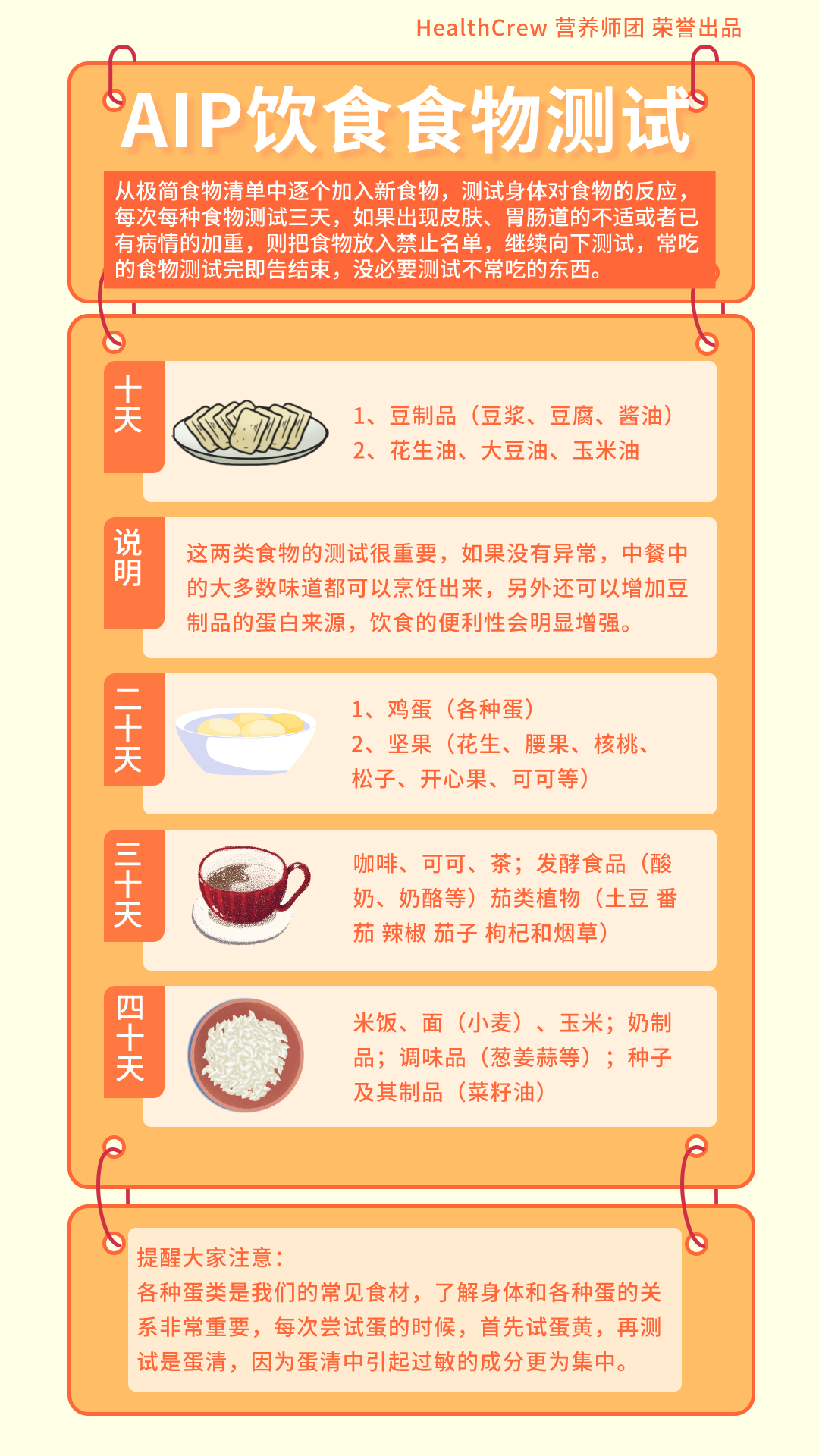 AIP饮食分为两个阶段,第一个阶段是极简的饮食方案,不包含禁止和避免食物,第二个阶段逐渐加入食物类别,每次一种食物,每种食物测试三天。