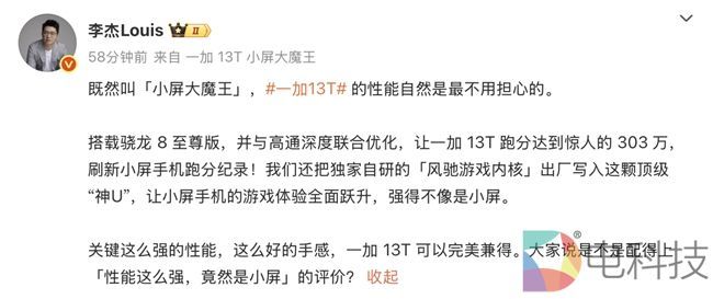 一加中国区总裁李杰表示,“一加 13T 搭载骁龙 8 至尊版,并与高通深度联合优化,把独家自研的「风驰游戏内核」写入芯片底层,让小屏手机游戏体验也全面跃升。这么强的性能,这么好的手感,一加 13T 可以完美兼得。”