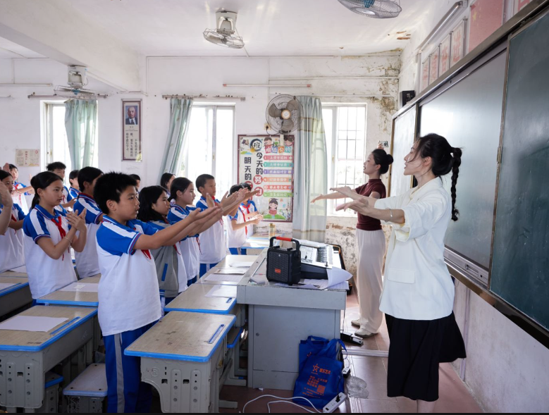 捐赠仪式结束后,精彩的公益课堂开始。来自大湾区的音乐教育志愿者老师们发挥专业特长,为同学们带来沉浸式音乐体验。课堂上,老师与孩子们积极互动,歌声、笑声回荡在校园。志愿者老师用音乐传递知识与爱,激发孩子们对音乐的热爱,让他们在旋律中感受美好,在歌声中收获自信。