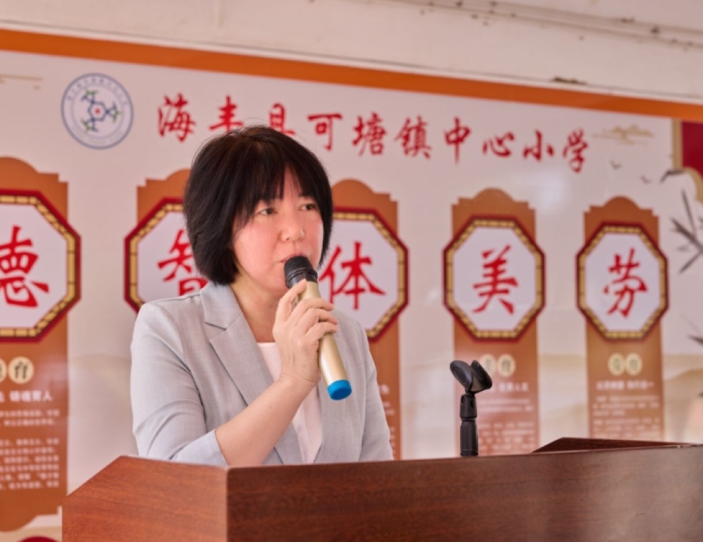活动在热烈的欢迎仪式中拉开帷幕,领导、嘉宾、志愿者老师和校级领导一同合影留念,记录这一珍贵时刻。随后,凌海英上台致辞。她表示,广东推进“百千万工程”,注重乡村教育文化软实力建设,“燃星计划”旨在用音乐赋能乡村教育,丰富孩子精神世界,这也是活动走进海丰的初心。她向支持活动的各方表达诚挚感谢,期待活动能为孩子们带来积极影响。
