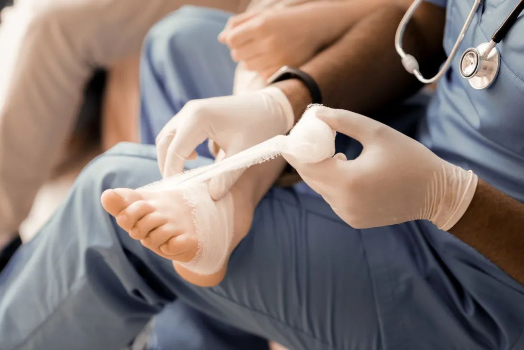 第二天一醒第一时间就去看自脚,好家伙,水泡不仅没有缩小的趋势,反而逐渐膨胀,脚背已经不能弯了。寒冬腊月,总不能光脚去医院,所以我拍下了照片拜托舍友跑一趟。校医院很人性化,一位医生阿姨提供了上门服务。我被舍友按在椅子上,蒙着眼睛,医生飞快地用针管挑破了水泡,然后用双氧水清洗了创面,最后涂抹了药膏,裹上纱布。临走时嘱咐我前两天是渗出期,让我隔一天去校医院换一次药。