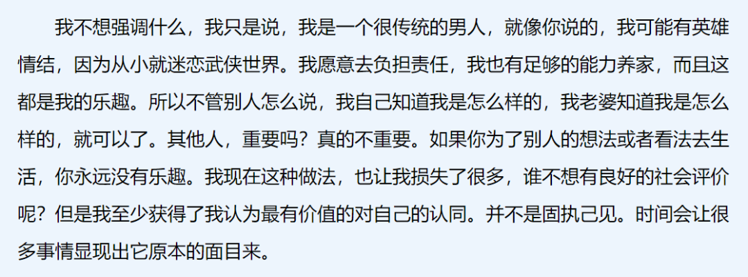 “我是一个传统的男人,我有英雄情结,我愿意去承担责任,我也有足够的能力养家,而且这都是我的乐趣。”