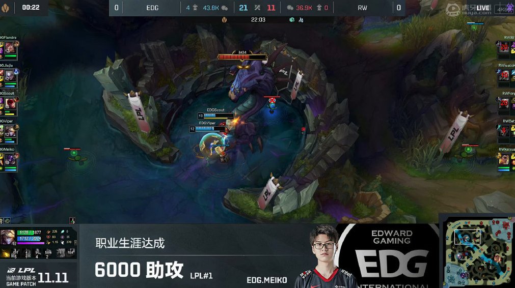 6月19日,EDG对战RW的比赛里,EDG辅助选手Meiko在首局比赛里拿到职业生涯第6000个助攻。