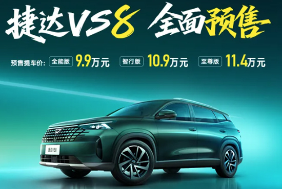 日前,车质网从相关渠道获悉,捷达VS8车型已经开启预售,新车共推出3款配置车型,预售价格区间为9.9-11.4万元,性价比出众,同时,官方还推出霸气焕新礼、驭享无忧礼、智联畅行礼等多项权益。