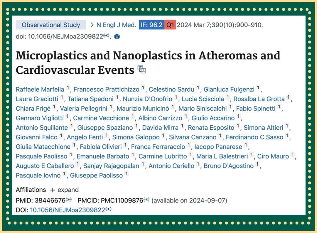 2024年,被 Nature 杂志评价为该领域的“里程碑式研究”,发表在医学领域权威期刊《新英格兰医学杂志》的研究显示,颈动脉斑块中检测到微塑料的人发生非致死性心肌梗死、非致死性中风或任何原因死亡的复合终点的风险比颈动脉斑块中未检测到微塑料的人高出 3.53 倍。