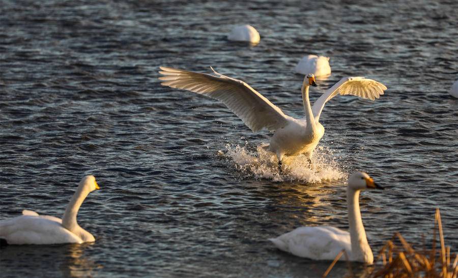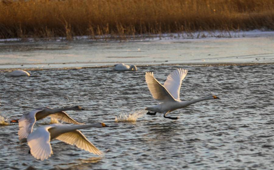 几瓢玉米撒下去,远处滩区的天鹅群有了动静。一家三口先起飞,绕着湖区盘旋,煽动翅膀,水面留下一条划痕。不大一会,数十只大天鹅把王厚礼围成了一圈。
