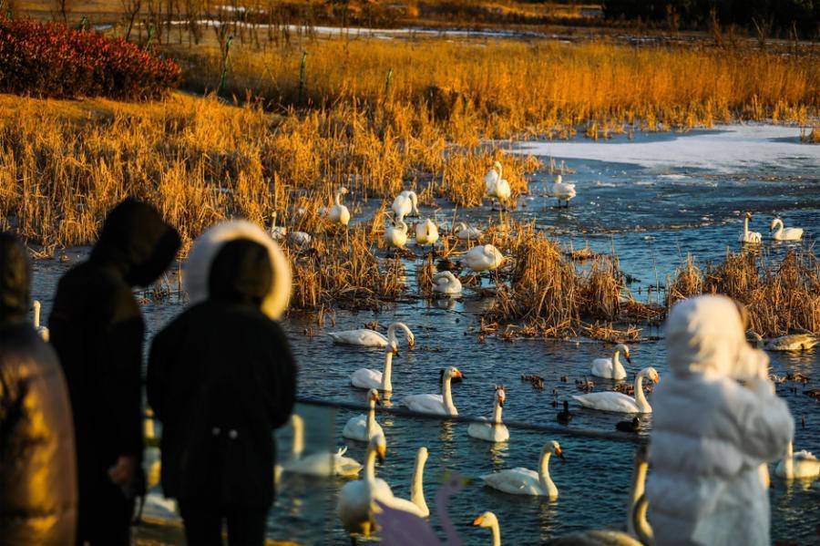 “嘿,嘿!”村民王厚礼的影子被拉得很长,他提着一小桶玉米粒,面对湖区,大吼了几嗓子,“当、当、当”敲着水桶。数百米外,是成群成群的大天鹅,远望一片雪白。
