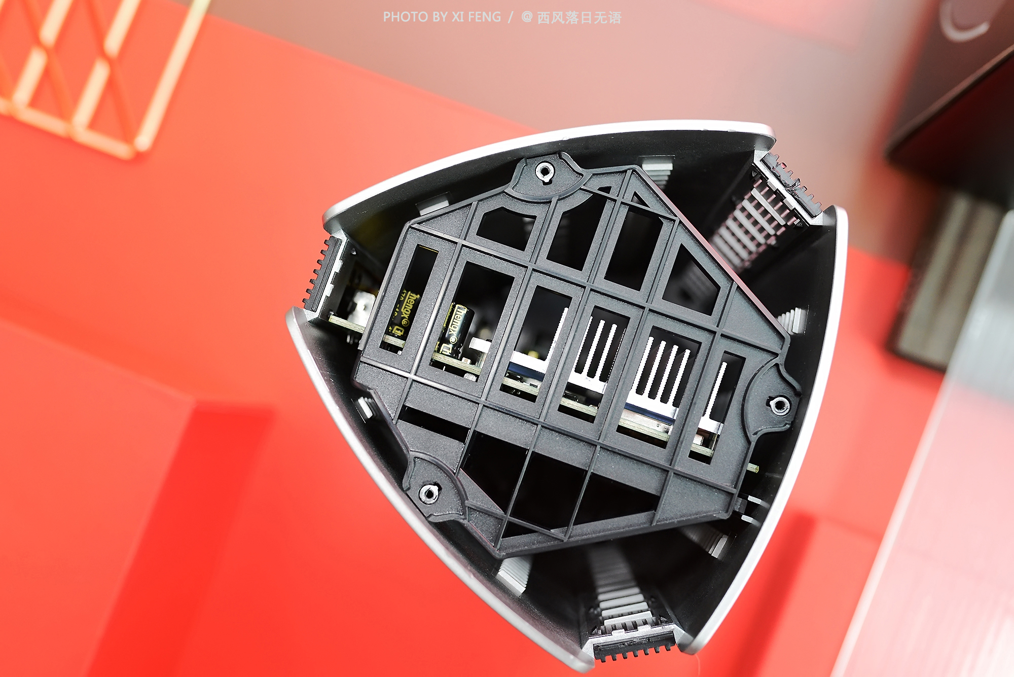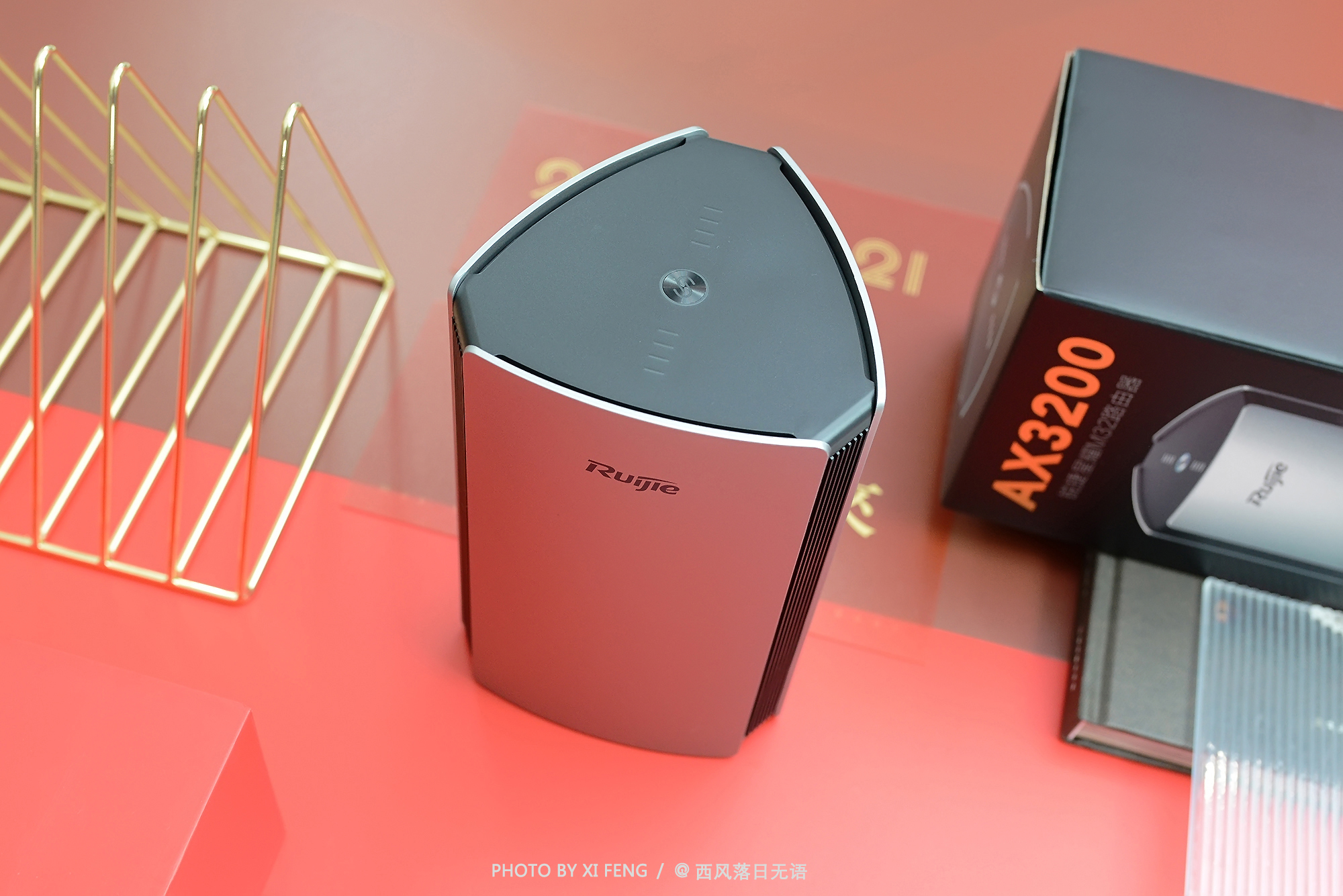 锐捷星耀M32路由器的外观采用内置天线的直立设计,妹纸看到它时说“长得真像个小音箱”。凸显科技味道的银黑配色,三角立柱型体的每个边角都带有整条的散热开槽,别说确实有点像便携音箱。