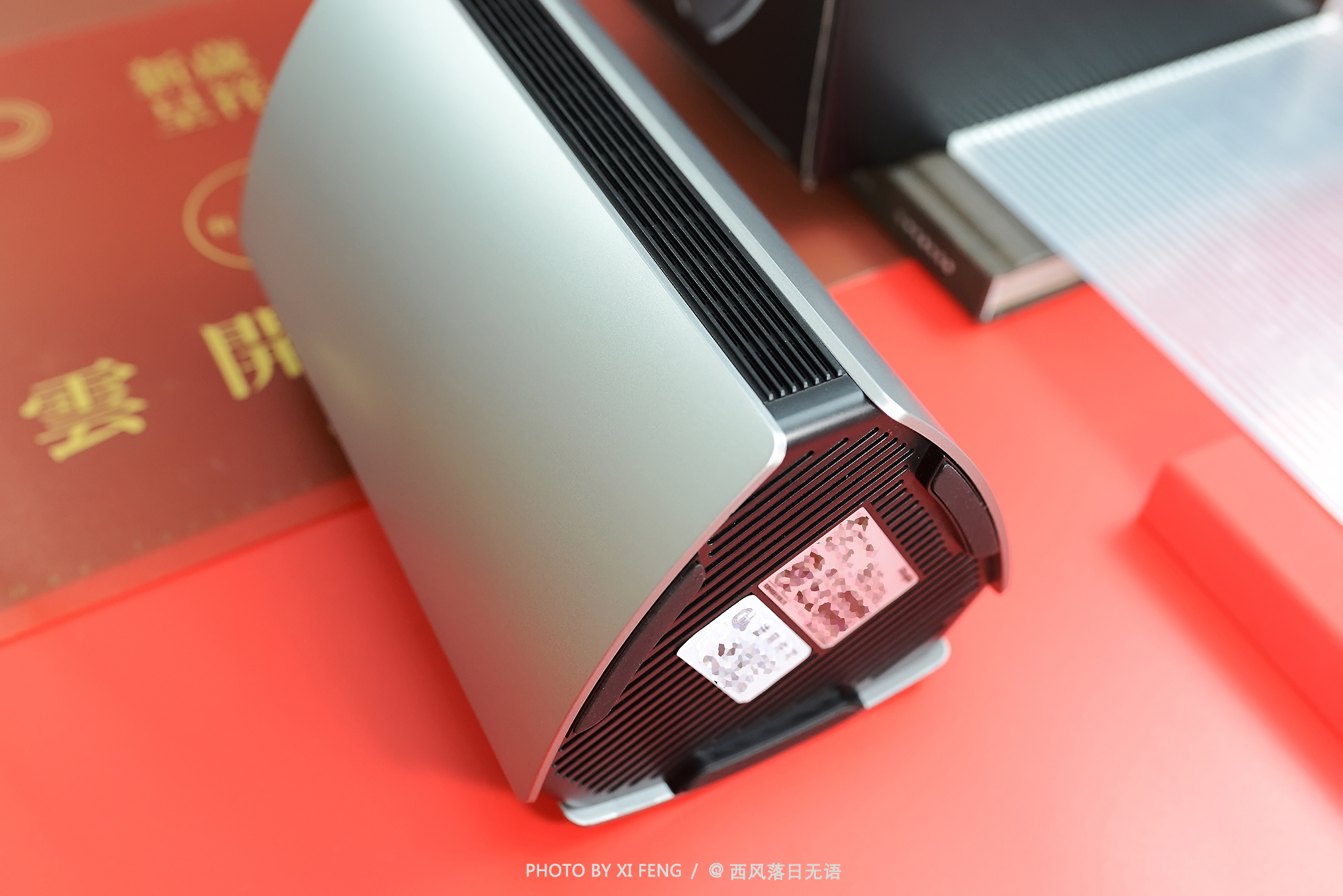 底部位置也是大面积的散热通道开槽,三个橡胶材质的垫脚,放置平面的抓地力很不错,垫脚里面是螺丝,想要拆机的话需要先撕开垫脚才行。