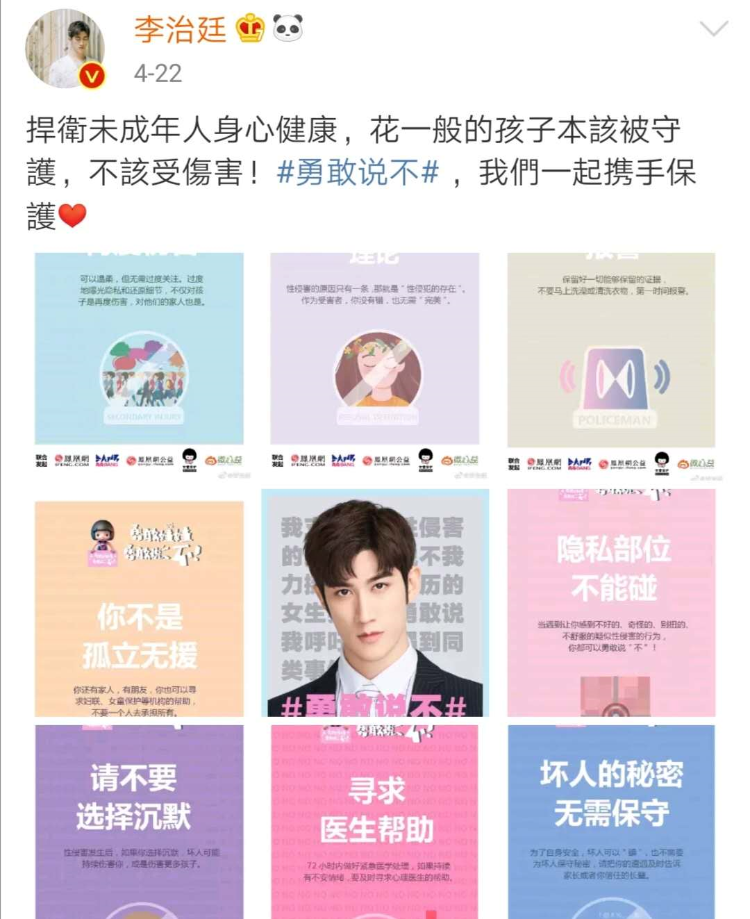 4月22日,李治廷参与勇敢娃娃“勇敢说不”防性侵知识普及与教育线上活动,鼓励孩子们在遭遇性侵害的时候,勇敢拒绝,勇敢说“不”,倡导社会大众对受害者更包容,营造平等环境。