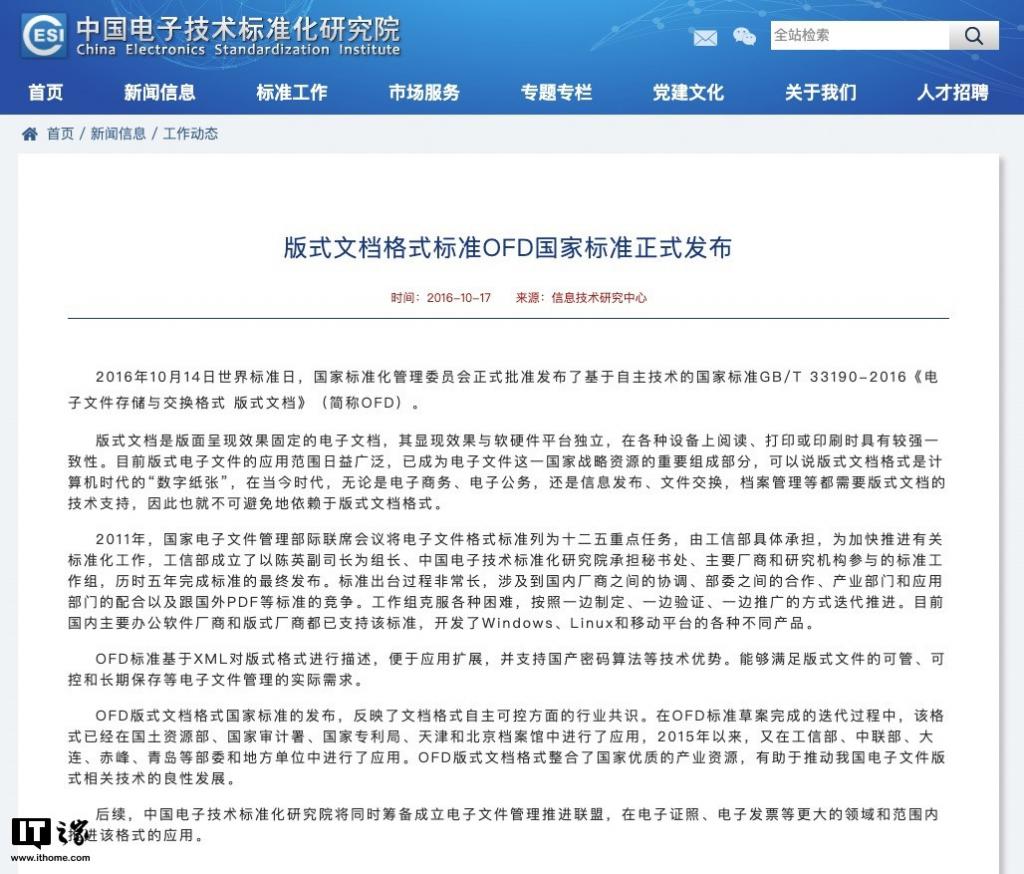 2016 年 12 月,国家质量监督检验检疫总局、国家标准化管理委员会批准发布的《党政机关电子公文格式规范》中明确要求 " 电子公文的承载格式为 OFD"。