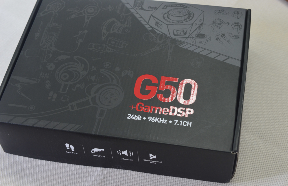 浦记G50套装外包装盒采用了别具一格的手绘设计风,右下角上带有红色"G50 GameDSP"字样,主体明确,处处彰显专业的吃鸡特色。盒子背面是套装产品的指示说明。