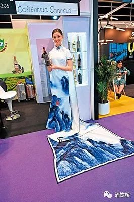 有道是「入境随俗」,这摊位推广加州酒,却请来洋妞穿了超长的水墨画旗袍,效果令人惊艳。