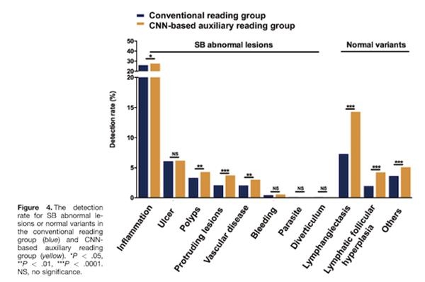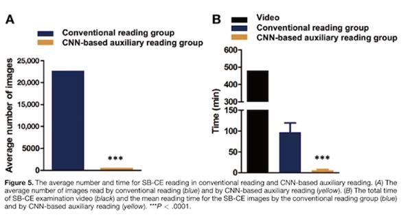 该研究收集2016年7月至2018年7月期间6970名患者的小肠胶囊内镜检查图片113,426,569张图像,分别通过常规方法阅片、深度卷积神经网络(CNNs)的人工智能图像辅助阅读模型。在CNN模型训练阶段,研究人员使用1970例患者的小肠检查图像建立模型;在模型验证阶段,用5000例患者的小肠检查图像验证模型。