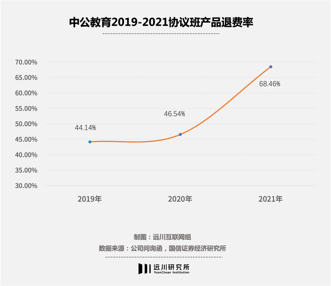 就在2021年,中公教育的退费率,从上一年的46.54%大幅提升到了68.64%。