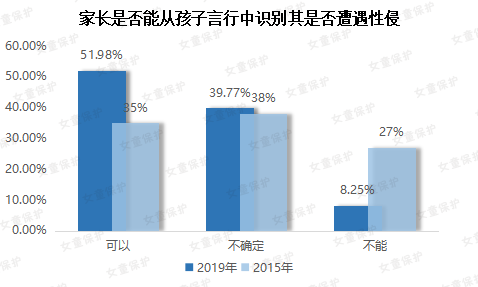“女童保护”统计,在2019年接受问卷调查的家长中,对于媒体频繁曝光的儿童遭遇性侵案例,57.03%的人表示听说过,28.71%的人很关注;14.25%的人表示不太了解;2015年,这一数据分别是43%、29%、28%。如果孩子遭遇性侵害,51.98%的家长表示能从孩子的言行中识别出来,39.77%的家长不确定,8.25%的家长表示不能;2015年,这一数据分别是35%、38%、27%。从这两组数据的对比中可以看出,这几年中,家长对对儿童性侵害的关注度和警惕意识都有比较明显的提升。
