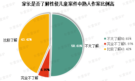 “女童保护”调查显示,对于儿童性侵案件中熟人作案比例高,50.61%的家长表示不太了解,5.97%的家长表示完全不了解,对此比较了解的占比为43.42%。对熟人也不可掉以轻心,已有案例表明,一些儿童性侵案就发生在受害人家中,甚至受害儿童监护人也在家,但由于儿童没有防范意识,家长对此也很无知,给了施害人可乘之机。