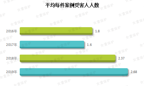 “女童保护”统计发现,2019年案例总数虽然相比往年相对较低,但平均每起案例受害儿童2.68人,高于2018年的2.37人、2017年的1.60人和2016年的1.80人。在301起案例中,受害人3人以上(包含3人,类似数据表述下同)的案例78起,占比25.91%;受害人5人以上的案例34起,占比11.30%;受害人10人以上的案例17起,占比5.65%。