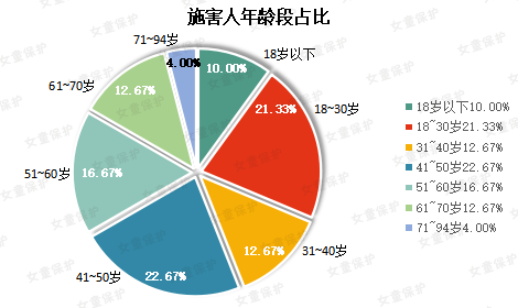 “女童保护”统计,301起案例中有150起表明了施害人年龄,施害人年龄最小的13岁,最大的94岁。150起表明施害人年龄的案例中,施害人18岁(不含18岁)以下15起,占比10.00%,这远远高于部分省份公布的未成年人犯罪数量占全部刑事案件的比例,需要警惕;18~30岁32起,占比21.33%;31~40岁19起,占比12.67%;41~50岁34起,占比22.67%;51~60岁25起,占比16.67%;61~70岁19起,占比12.67%;71~94岁6起,占比4.00%;总体上算,施害人40岁以上的占比59.33%。