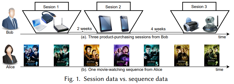 近些年来,为了弥补上述不足,基于会话的推荐系统 (session-based recommender systems (SBRSs)) 悄然兴起,并引起了越来越多的关注。不同于上述推荐系统,基于会话的推荐系统从用户在交易过程中产生的会话 (session) 数据来挖掘和学习用户的偏好。每一个会话包含在一段连续的时间段内发生的多个「用户–物品交互行为」,比如某用户在一次交易会话 (比如从登录电商平台的账号到退出账号这段时间)中购买了一篮子物品。通过将每一个会话作为最基本的输入数据单元,一个基于会话的推荐系统能够从一个用户的最近产生的会话中捕获他的短期偏好,以及从一个会话到另一个会话之间的偏好的变化,从而进行更精准和实时的推荐。