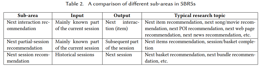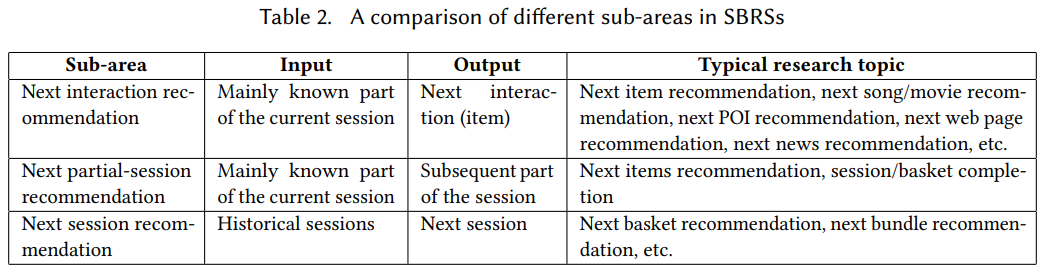 在本文中,研究者用基于会话的推荐系统来指代那些所有以 session 数据为中心来推荐当前会话里的下一个物品,接下来的所有物品以及下一个会话里的所有物品的推荐系统。这个定义包括了有些文献中的一些狭义的基于会话的推荐系统,它们只推荐当前会话里的下一个物品。