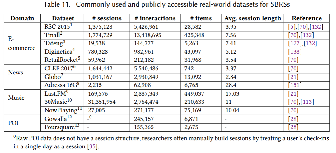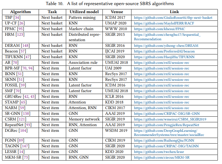 研究者分析和讨论了基于会话的推荐系统的主要的实际应用领域和场景、收集和整理了典型算法的开源代码和常用的公开数据集。