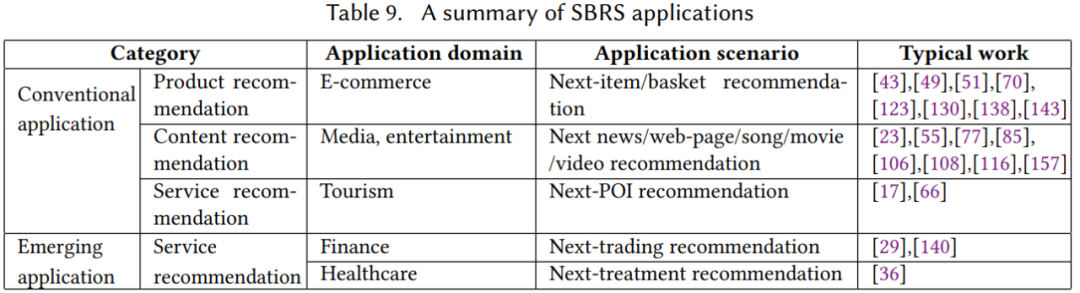 基于会话推荐系统已经被广泛应用于现实世界的各个领域和场景当中,来使客户和企业获利。下表总结了这些传统的和新兴的应用领域。