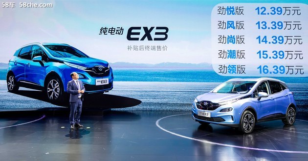 4月16日上海车展开幕当天,北汽新能源正式发布EX3,新车续航501-630km,共推出5个版本,补贴后售价12.39万元-16.39万元。