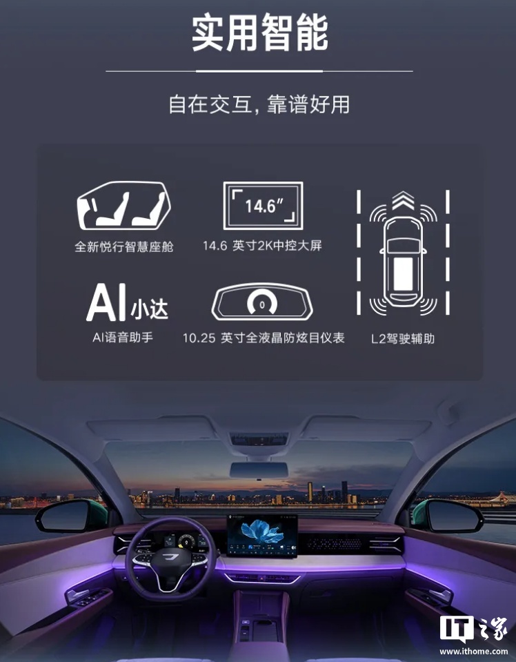 该车内饰部分采用了 10.25 英寸全液晶仪表 + 14.6 英寸悬浮式中控屏,换挡机构与大众 ID.电动车的怀挡设计比较类似,还配备了多色氛围灯。