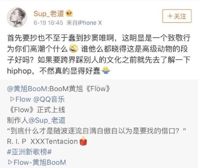 不过,此前《Flow》的歌曲制作人曾说,这是致敬行为。并且怼了网友,认为表示质疑的摇滚歌迷不懂hiphop文化。