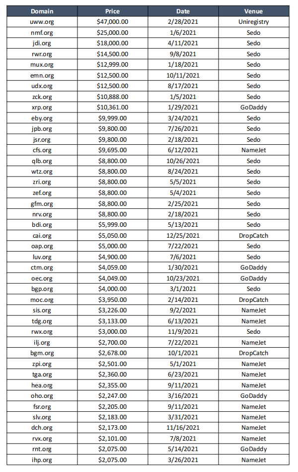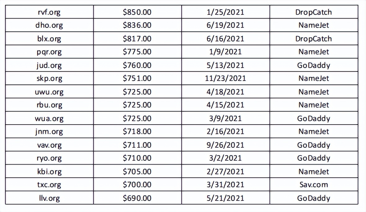 据NameBio公开数据显示,2021年共记录了156个三字母.org域名的交易,销售总额为$397,736美元(≈¥253万元)。