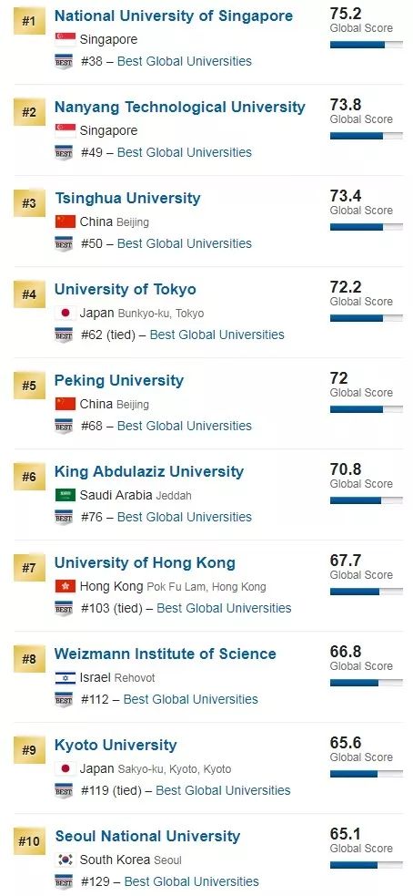 亚洲地区,排名前三位的高校为新加坡国立大学、南阳理工大学和清华大学,东京大学和北京大学分别位列第四和第五位。